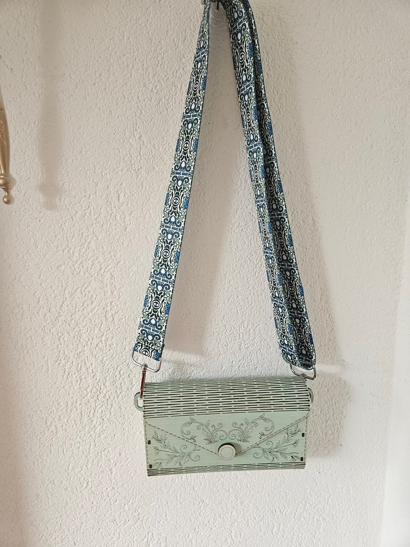 Bijzondere tas van hout voor o.a. mobiele telefoon. Inclusief schouderband.